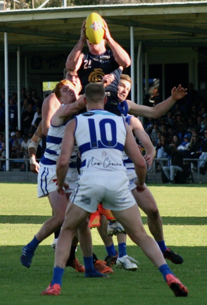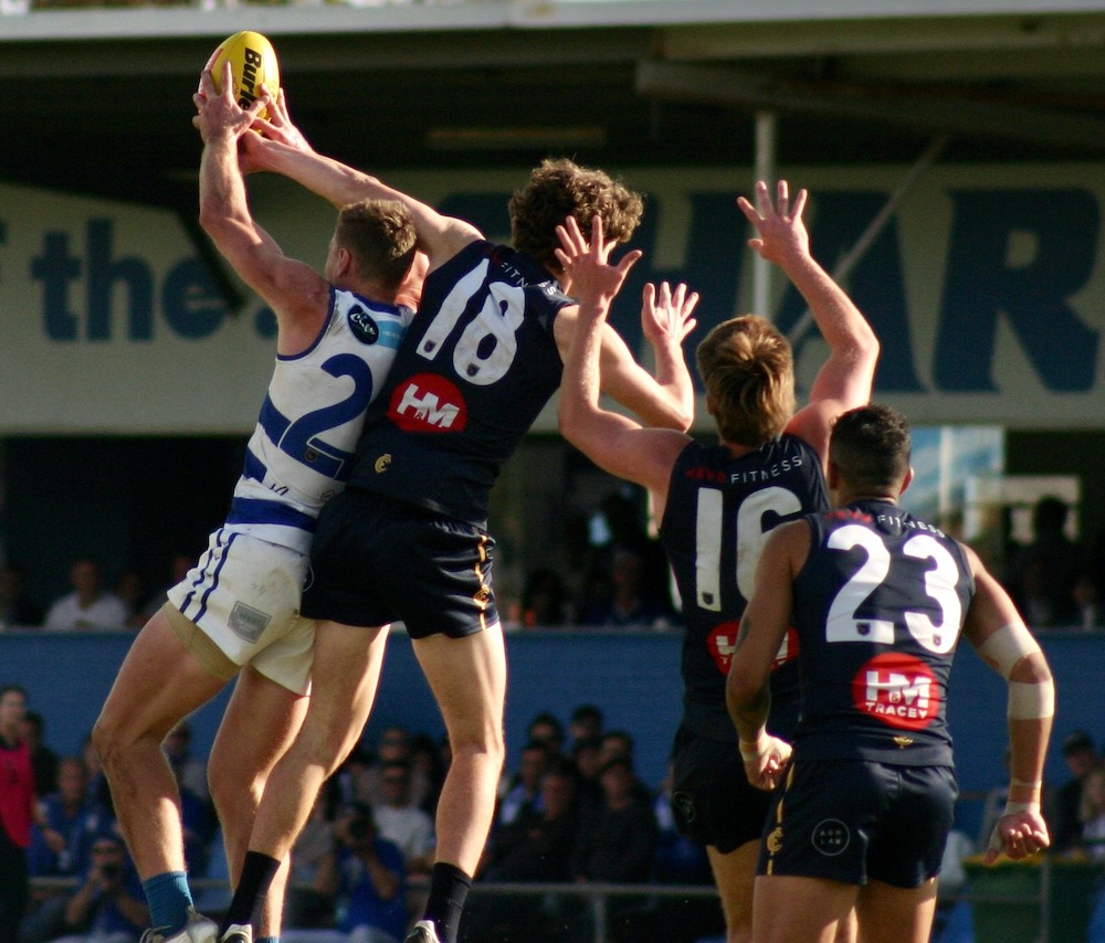 At Claremont Oval on Sunday the home team took control after conceding the first two goals and never really looked in danger. A burst of three goals inspired by Neil Erasmus in the second quarter tied the scores but by half time the margin was out to 20 points and the challenge had been answered. Tiger stars Jye Bolton and Bailey Rogers were at their best but some lesser lights also caused plenty of damage. Tyron Smallwood kicked three goals and set up others in an inspired display, Oliver Eastland squared the ruck battle with Lloyd Meek, Alex Manuel scored five goals, Max Spyvee got three, Jack Buller was a good forward target, Timm House enjoyed running around in the backline and Ronin O’Connor was effective in a defensive role in the midfield.